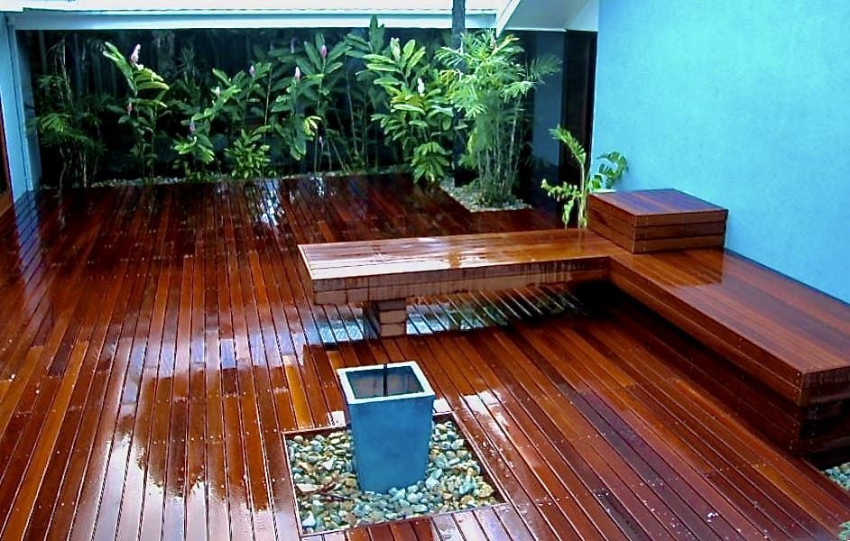This was formerly a very messy patchwork of some pine decking, some hardwood decking, pavers, plants and outdoor furniture in a poolside patio of a beachfront house.